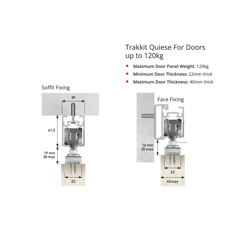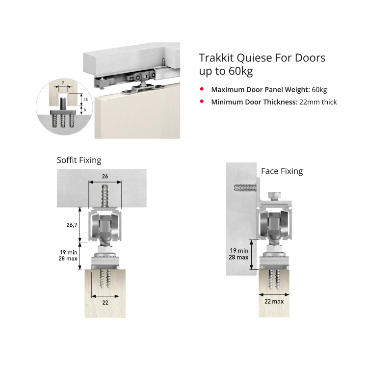 The Trakkit Quiesce top-hung straight wardrobe sliding door runners kit is a fully adjustable and easy to install product. Ideal for cabinet, wardrobe, and other interior sliding doors needs that ensures a smooth running quiet and smart door set.